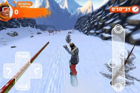 Quatre pistes sont proposées, leur localisation est pour le moins surprenante : Japon, Chili, Alaska et Espagne. Les personnages proposés sont également au nombre de quatre. Mario, Gordon, Mats et Alex proposent tous des caractéristiques différentes en vitesse, contrôles et tricks. En pleine partie, ces différences ne se ressentent pas vraiment. Les contrôles, enfin, sont assez complets et bien pensés. Un bouton d’action, situé en bas à droite de l’écran sert à sauter (en l’air, sur une rampe, etc.) ou bien encore permet d’activer le boost de vitesse, par une pression plus longue. Pendant un saut, votre planche de snow apparaît en transparence sur l’écran. Quatre zones bien identifiées permettent d’effectuer les tricks : nose, melon, indy et tail. Pour les rotations, rien de plus simple : il suffit d’appuyer vers la droite ou gauche de votre stick directionnel virtuel, plus ou moins longtemps. Même chose pour les flips ou backs flips, avec les directions haut et bas. Pendant les grinds, on incline son appareil vers la gauche ou la droite, l’accéléromètre de l’iPhone contrebalance ainsi l’inclinaison de votre personnage. Voilà pour la technique, il y a en tout une cinquantaine de figures possibles.