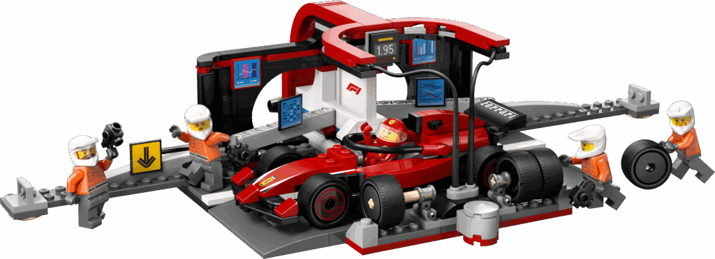Autour de cette gamme gravitent aussi des sets complémentaires, comme les arrêts aux stands avec blocage de voiture et changement de pièces !