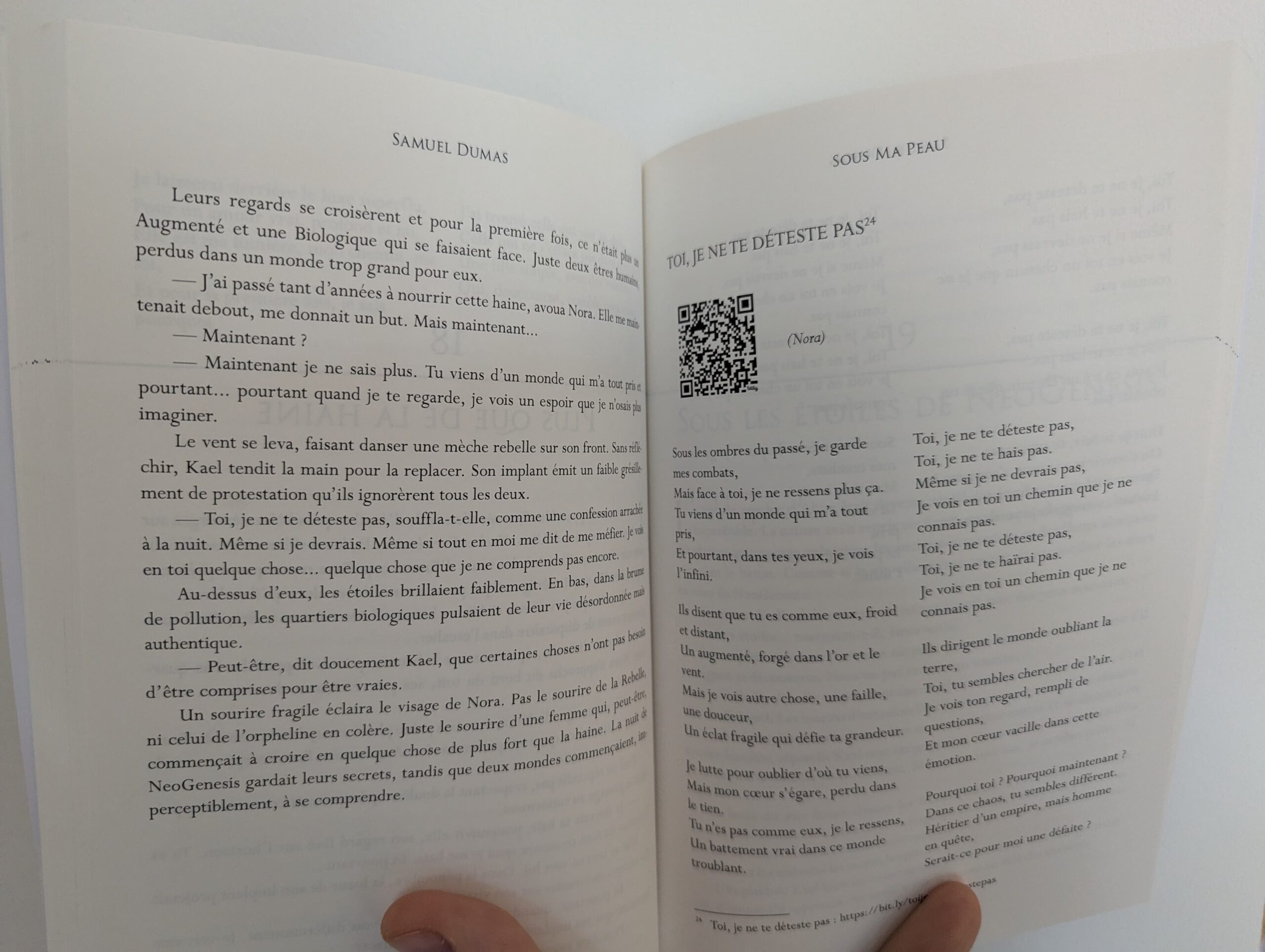 Ce qui rend Sous ma peau unique, c’est cette manière de faire vivre le récit en temps réel. Pendant que les personnages évoluent dans un monde fragmenté, le lecteur est invité à scanner un QR code à la fin de chaque chapitre pour écouter la chanson associée. Est ce que cela hâche un peu le récit ? Oui. Mais si vous voulez un ouvrage classique que vous pouvez dévorer sans lever les yeux des pages, vous en trouverez des milliers ! Profitez plutôt de l’expérience unique proposée par Sous ma peau.