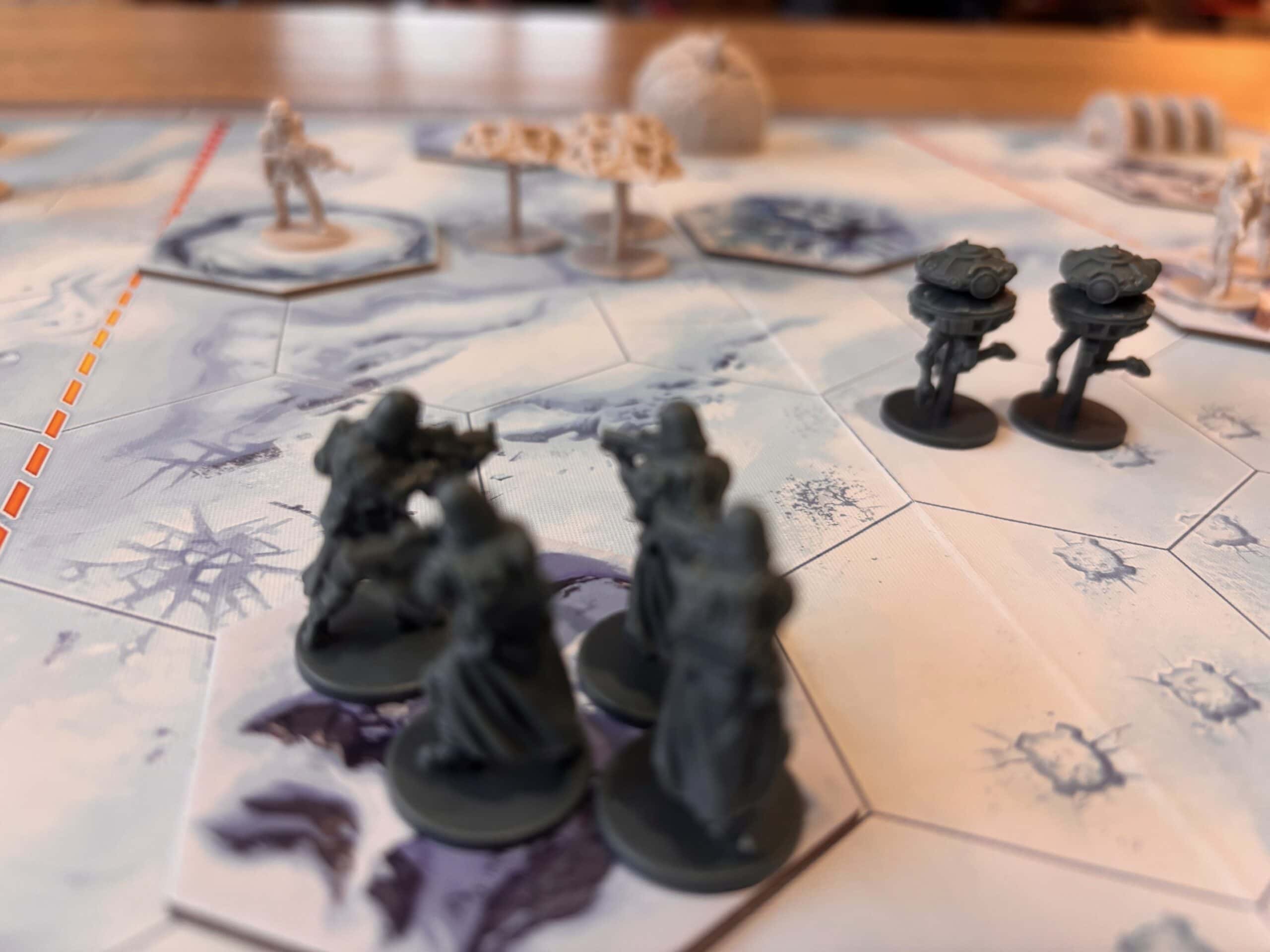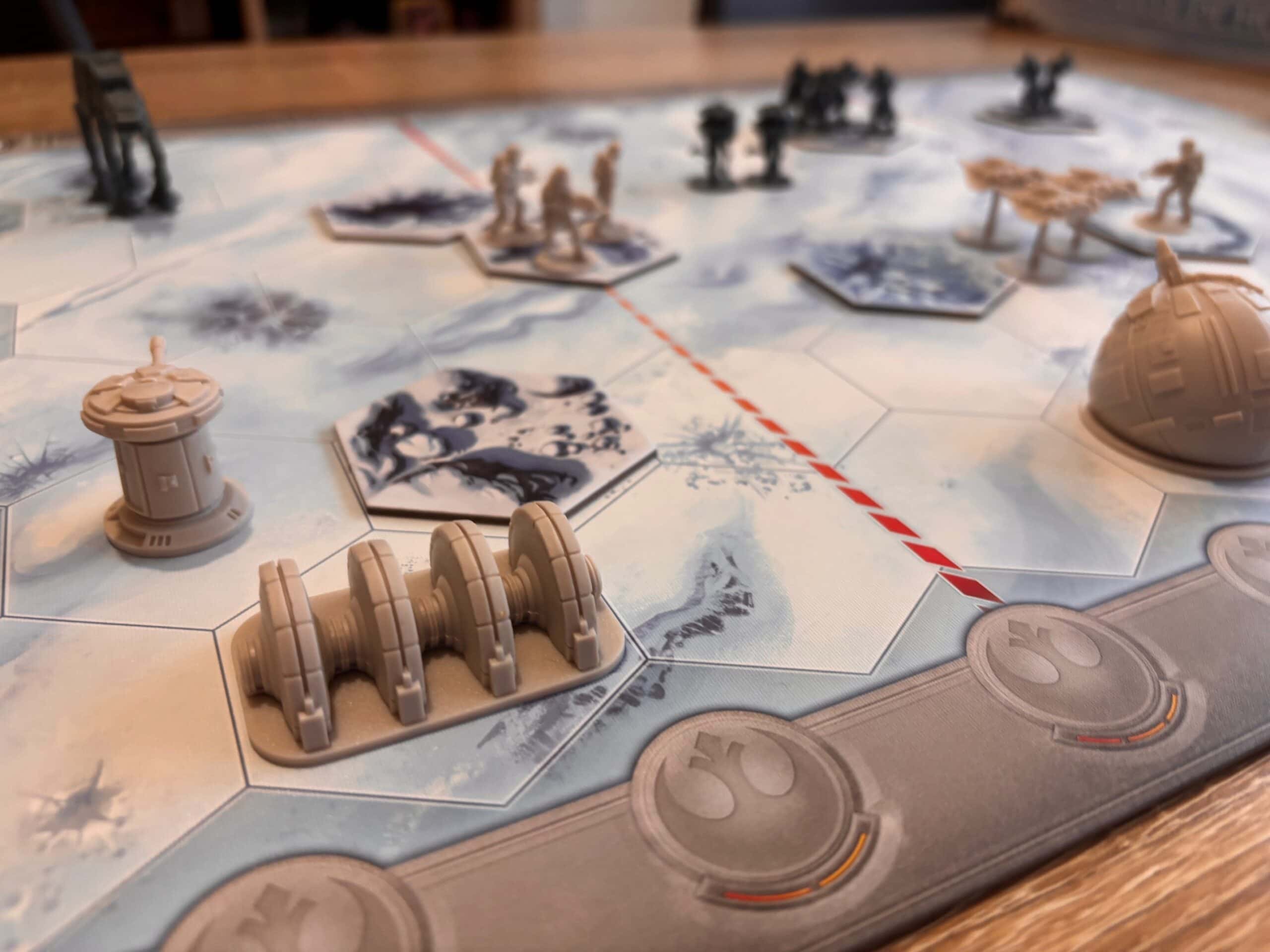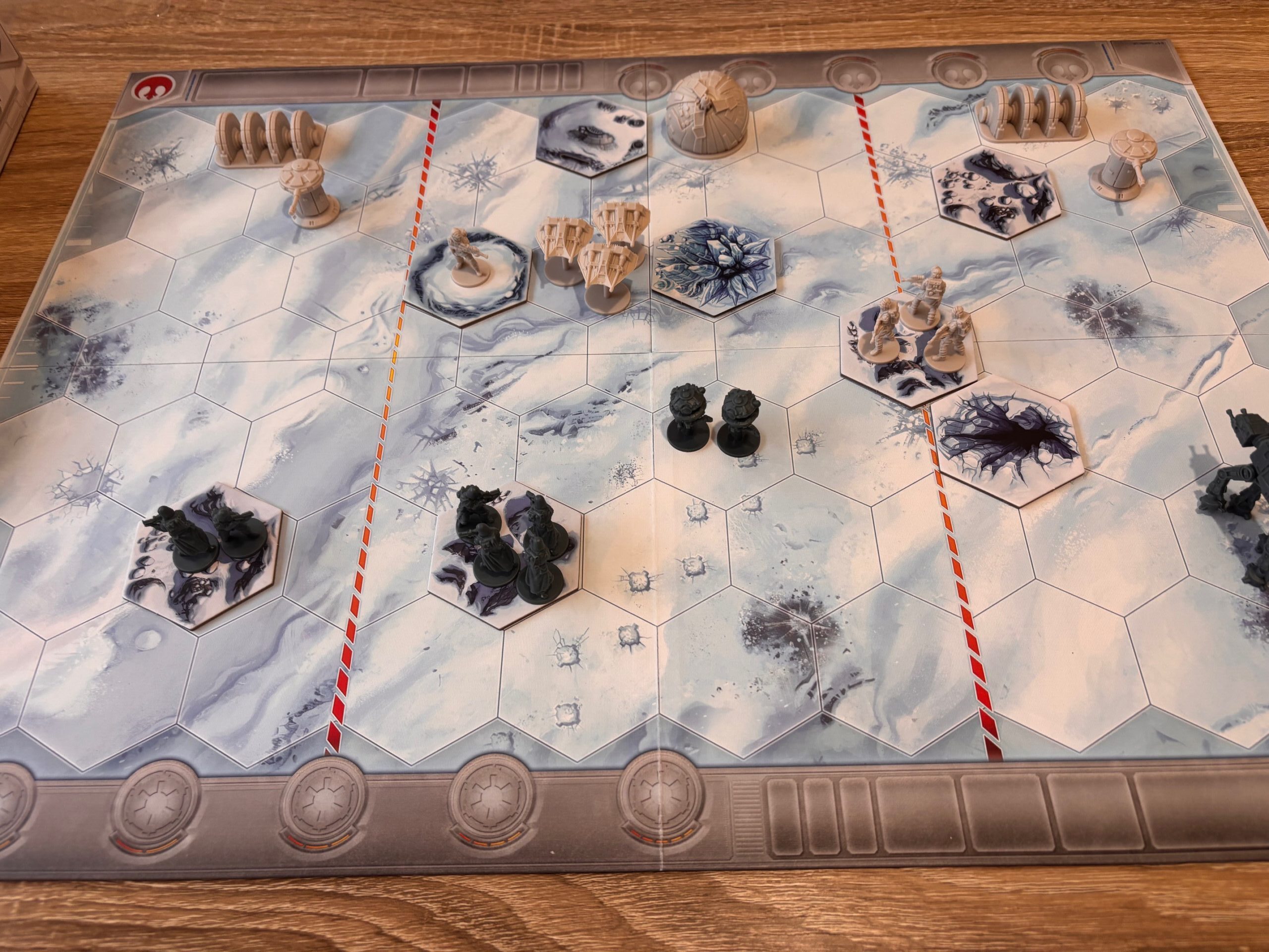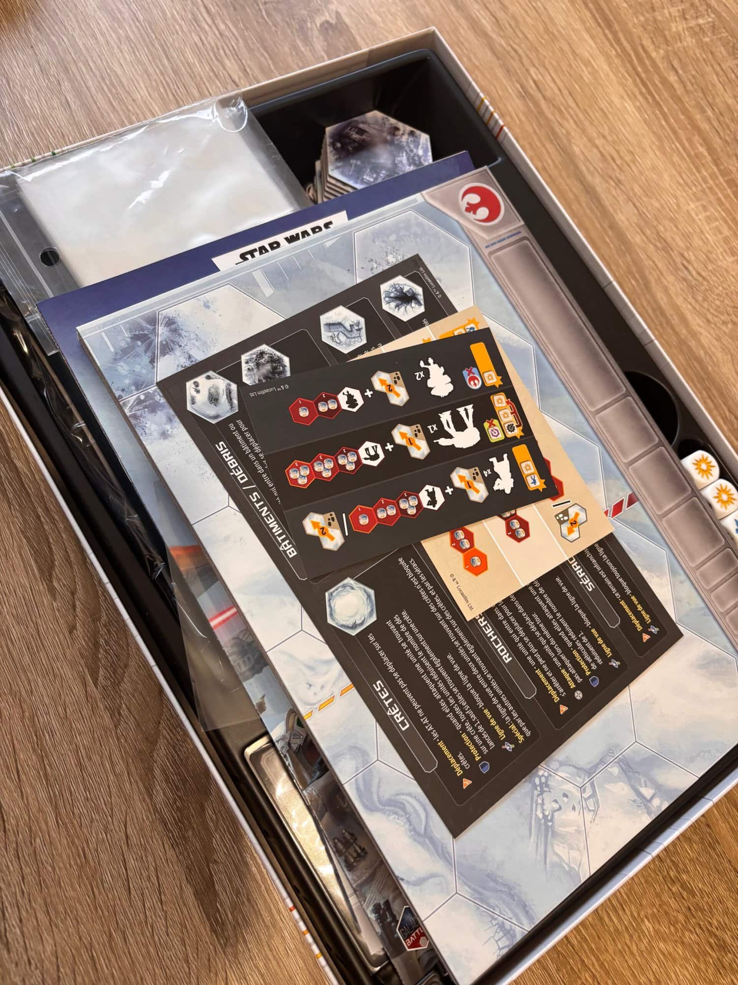 C’est sans doute le seul vrai reproche que je ferai à cette édition : le plateau. Certes, il est réversible, avec un format horizontal et vertical, mais dans les faits, on reste sur la même étendue blanche de Hoth, glaciale et un peu triste. Le changement d’orientation ne suffit pas à renouveler la sensation de jeu. C’est surtout l’ajout des tuiles qui vient sauver la mise : crêtes, crevasses infranchissables, tranchées, zones de couvert, villes dévastées… Ces éléments ajoutent de la variété et du relief, à la fois visuel et stratégique. Sans elles, le plateau manque un peu de vie. Avec elles, on retrouve ce qu’on attend d’une vraie bataille Star Wars : des positions à défendre, des lignes de tir à optimiser, et des mouvements risqués mais satisfaisants.