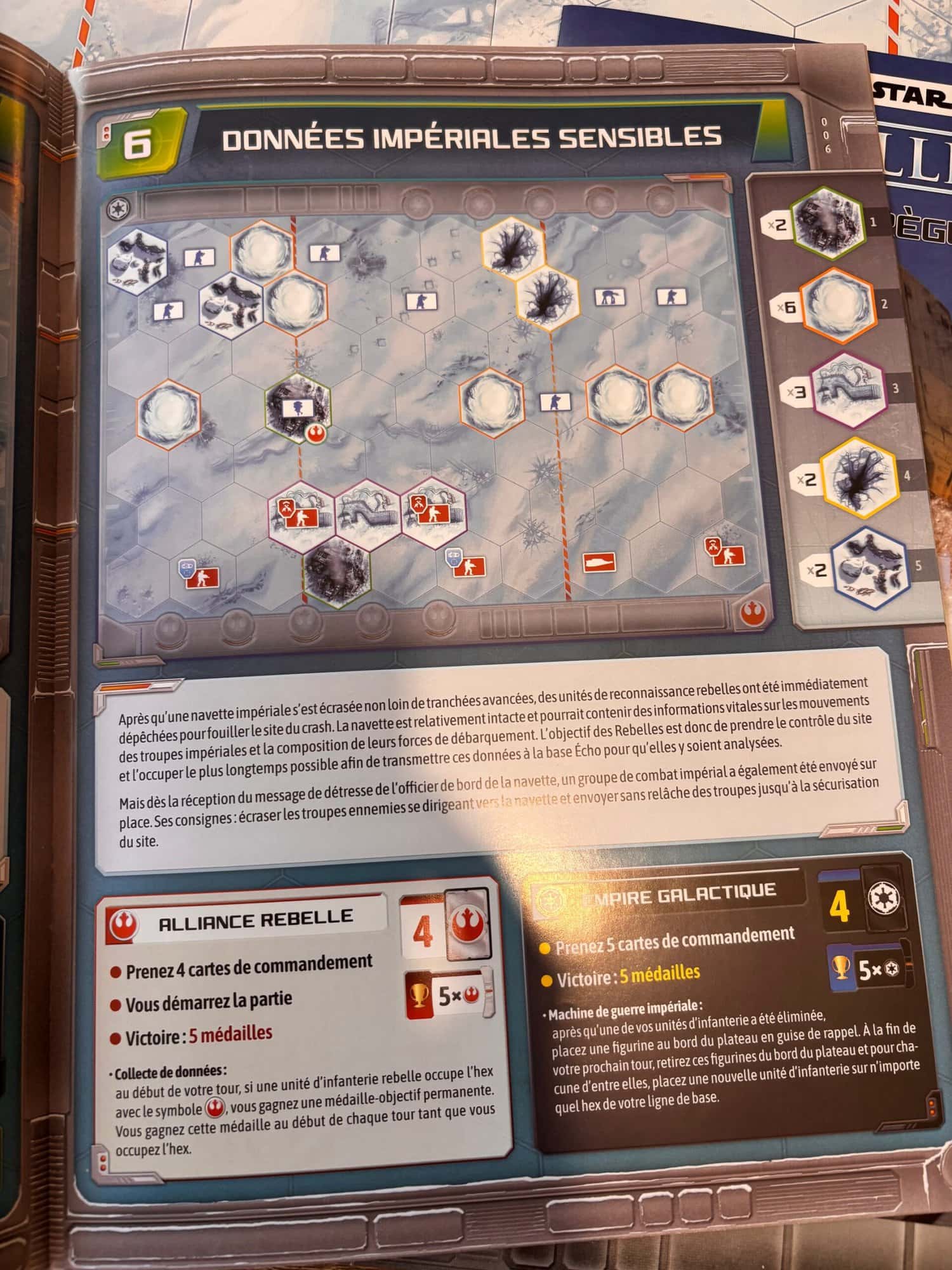 Le livret de scénarios est un vrai plaisir. Pas moins de 18 batailles sont proposées, avec des conditions de victoire variées et des objectifs différents selon les camps. Mais le plus intéressant reste les campagnes. Le jeu en propose quatre : deux pour les Rebelles et deux pour l’Empire. Ces campagnes s’enchaînent de façon narrative, vos résultats influencent la suite, et on a presque l’impression de jouer un mini livre dont vous êtes le héros. C’est bien écrit, fluide, et ça donne une dimension supplémentaire au jeu.