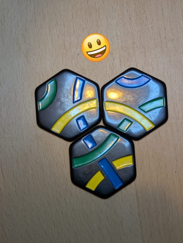 Le jeu est constitué de 56 tuiles hexagonales numérotées, chacune unique. Chaque tuile porte trois bandes de couleurs : rouge, jaune, bleu ou vert. Le matériel est simple, mais élégant et de qualité.