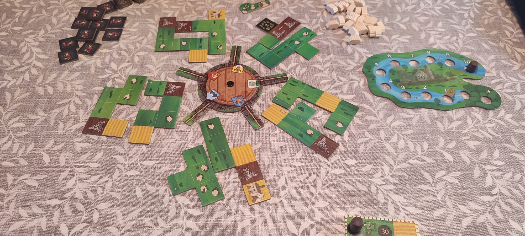 Chaque village possède un emblème que vous retrouverez sur la roue. Un joueur la fait tourner, puis vous choisissez l’un des deux éléments en face de votre emblème. La seule contrainte : la tuile doit être posée adjacente à une autre déjà placée. Vous pouvez la retourner dans tous les sens, recto ou verso, ce qui offre beaucoup de liberté.