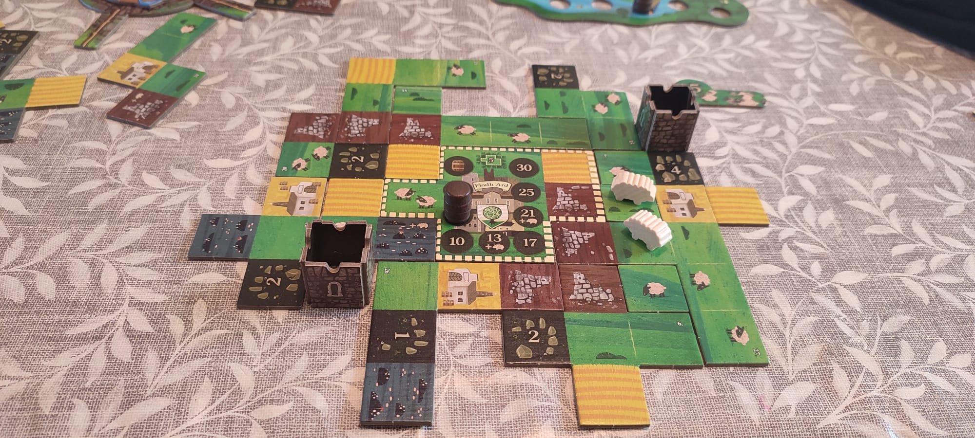 Dans Tipperary, tout le monde joue en simultané. La roue centrale indique les tuiles disponibles à chaque tour, et vous devrez trouver le bon équilibre entre champs, ruines et troupeaux… voire même brasser votre propre whisky !