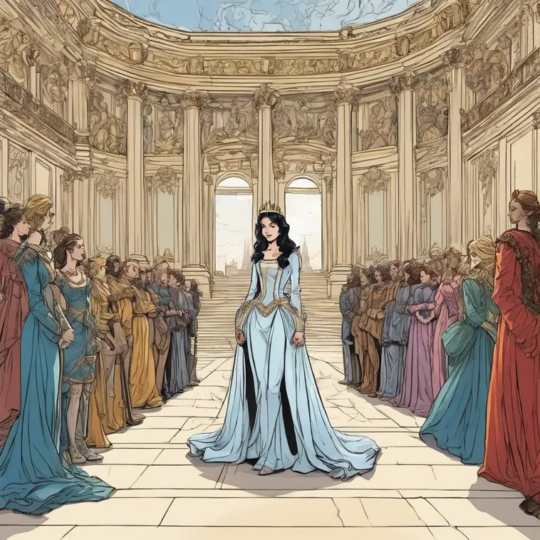 Roi ou reine dans un palais baroque avec un cortège de noble vêtus d'élégantes robes médiévales.