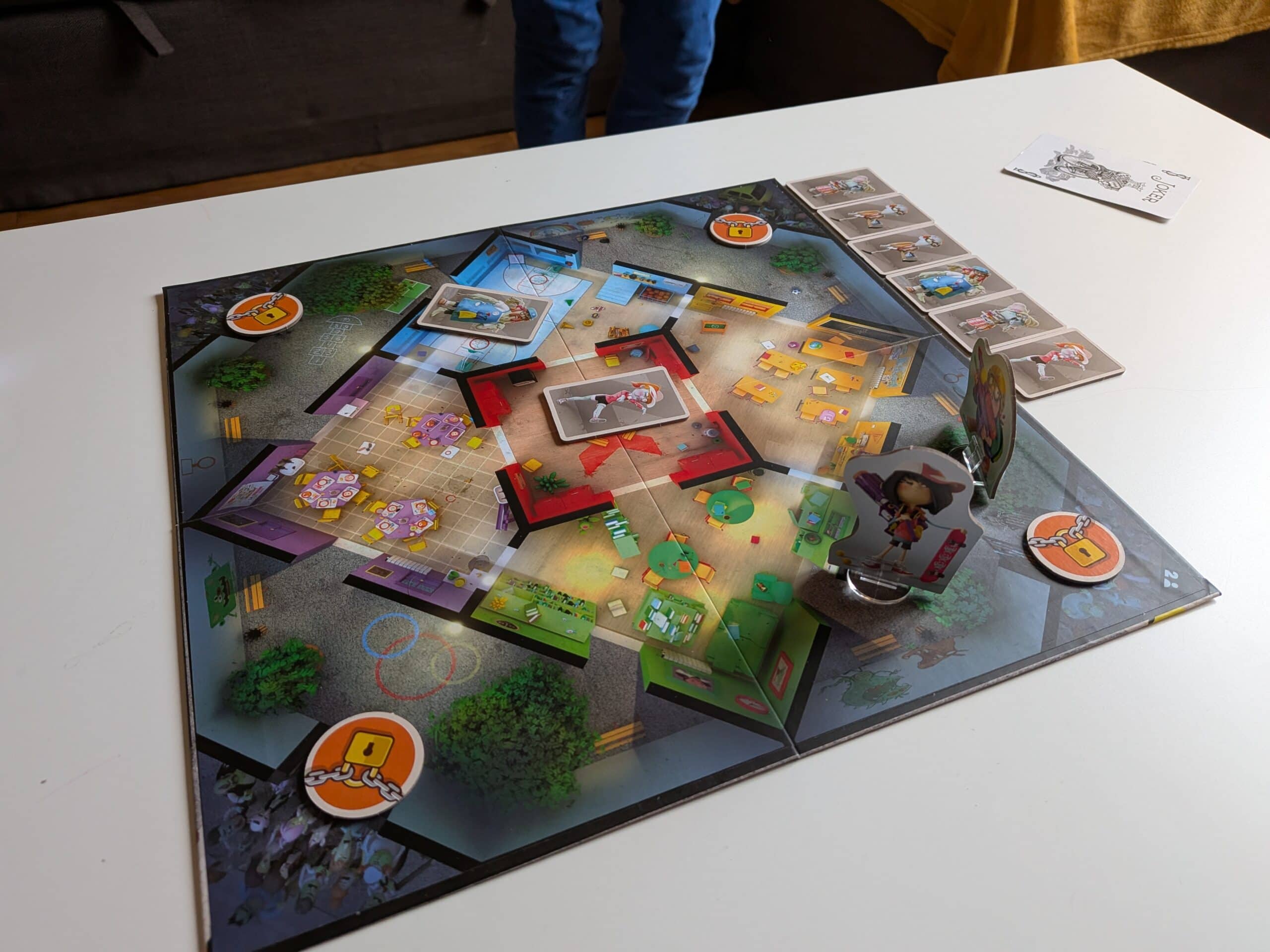 Dès l’ouverture de la boîte, les couleurs sautent aux yeux. Le matériel est coloré. Les figurines de zombies sont en carton épais. Le plateau, recto-verso, représente une école vue du dessus. Chaque entrée est bien visible.
